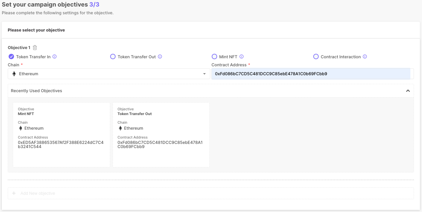 To set up campaign objectives, you can choose between Token transfer in, token transfer out, mint NFT or contract interaction.