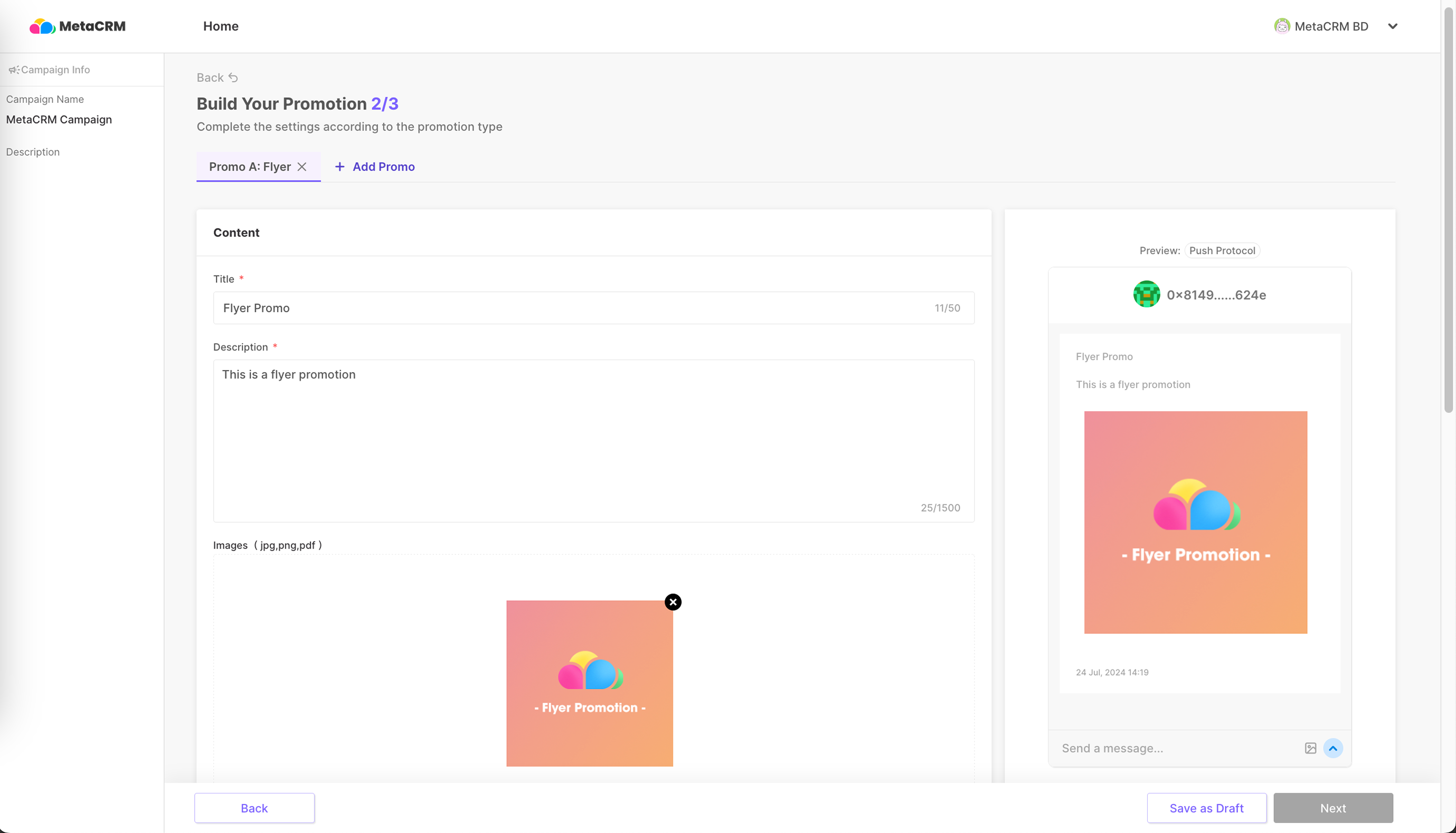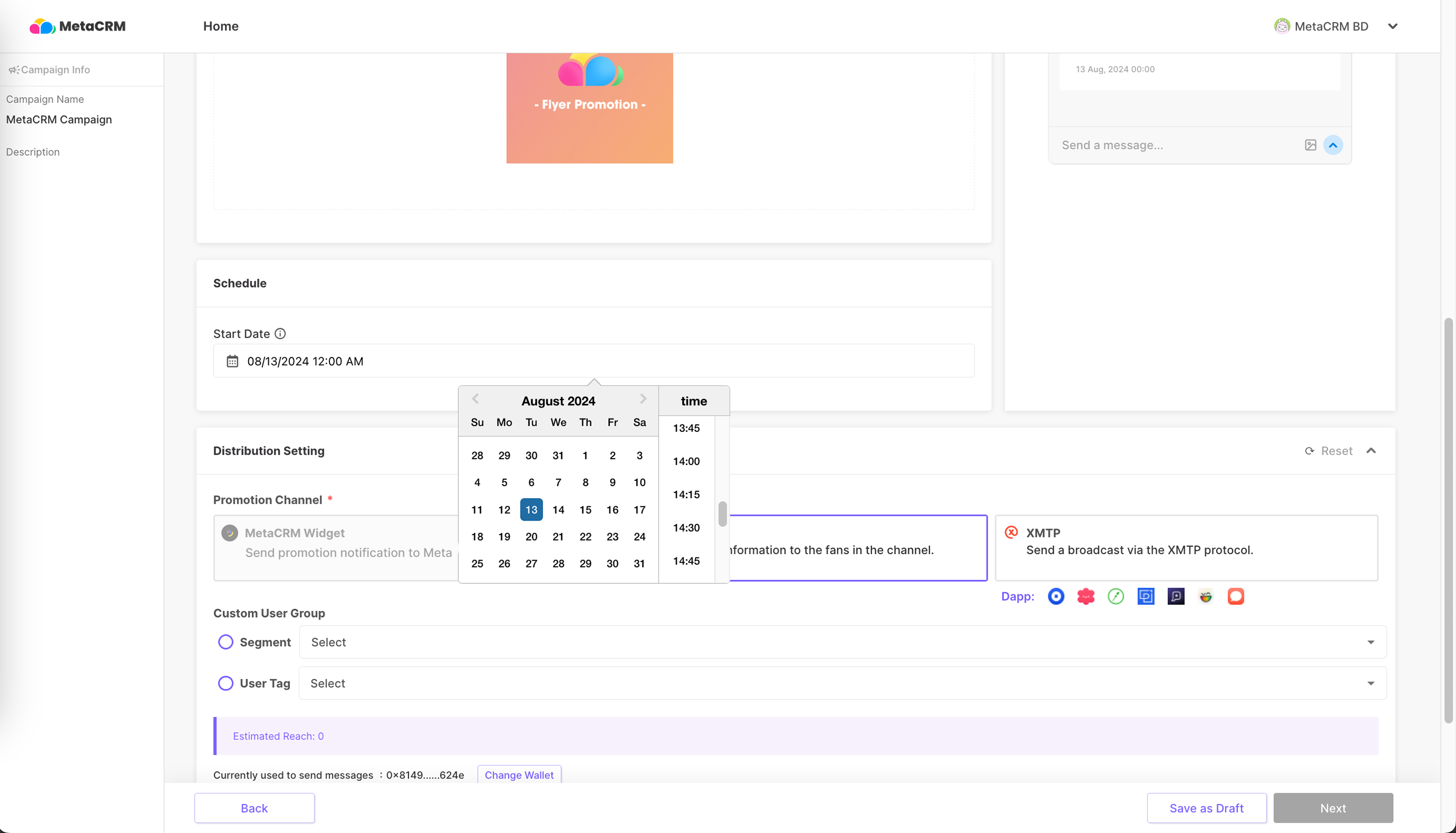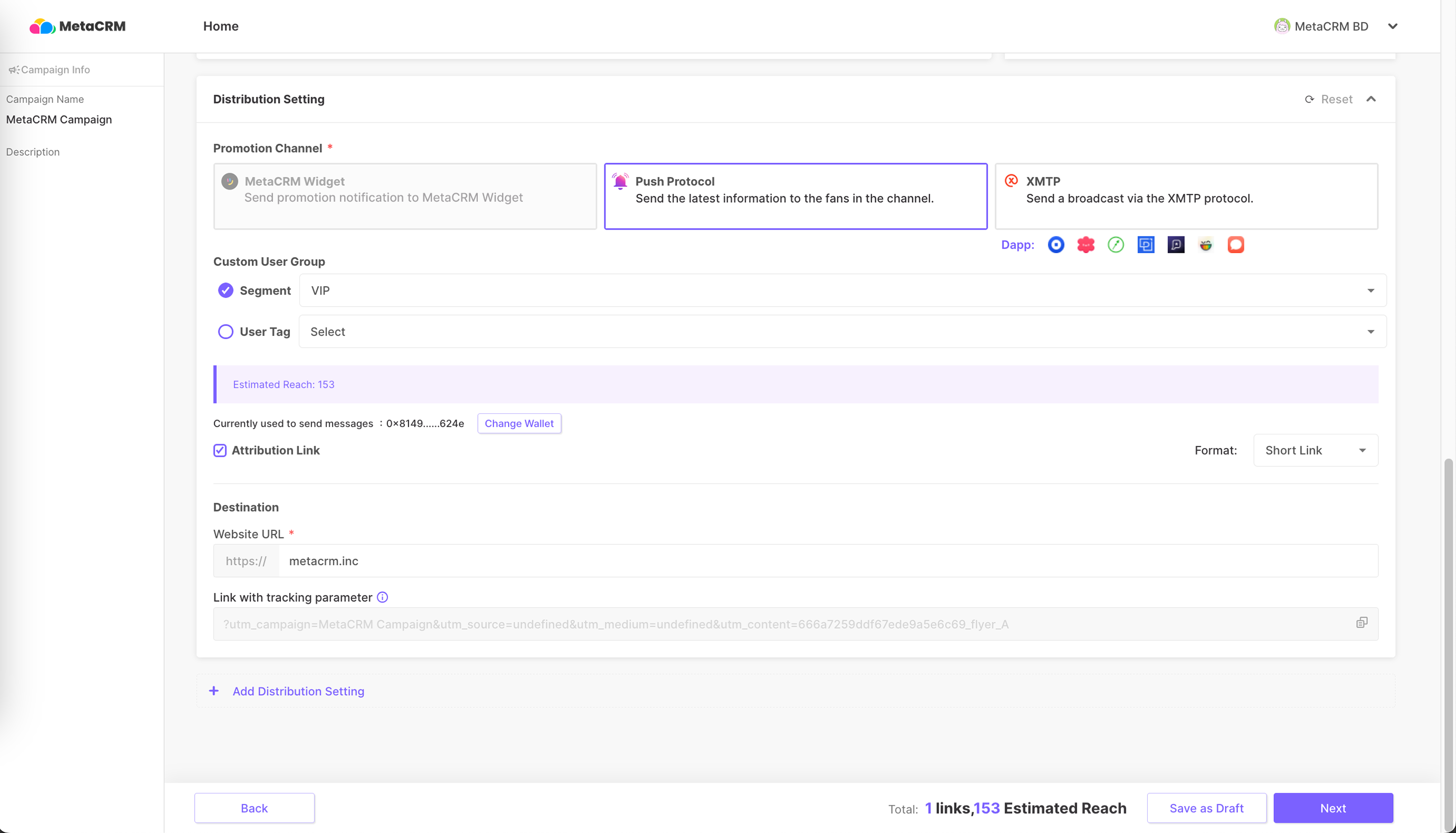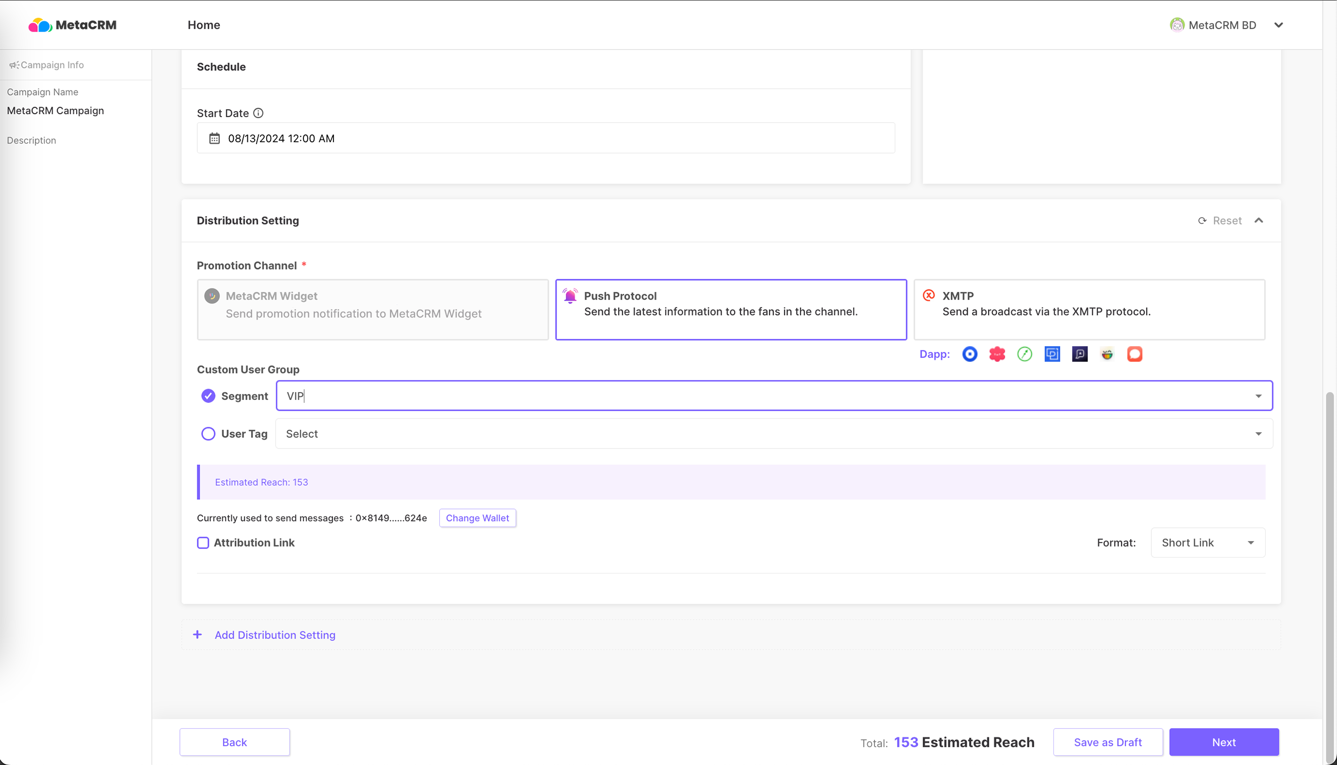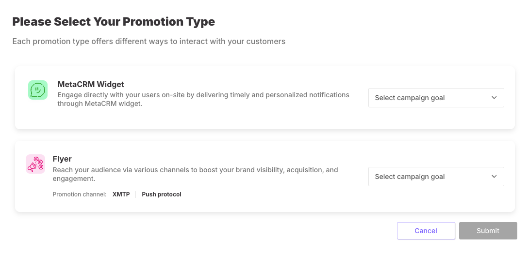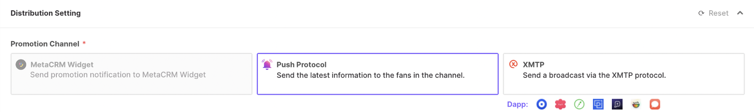 Select the channel you would like to distribute your content. Currently, we offer ***MetaCRM Widget (You need to integrate*** [***MetaCRM widget***](https://metacrm.gitbook.io/metacrm/settings/integration/metacrm-tracking-tag) ***before setup), Push Protocol and XMTP*** (more coming soon!)